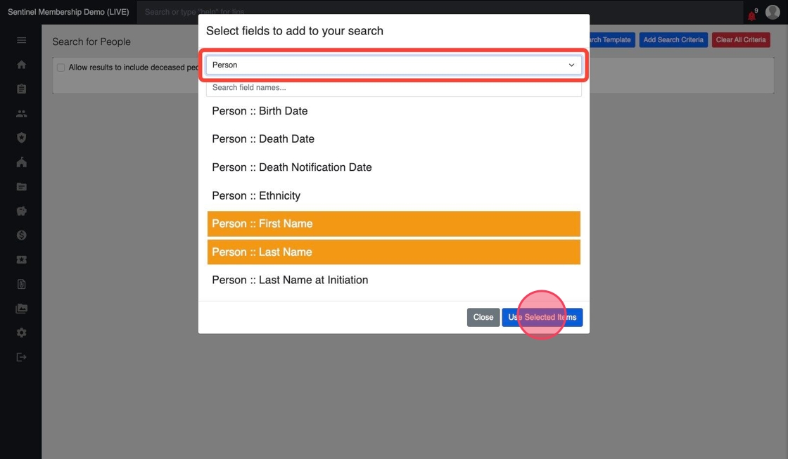 In this example, we select "Person" in the drop down list. Then we'll click "First Name" and then holding the control or command key on your keyboard, also select "Last Name."