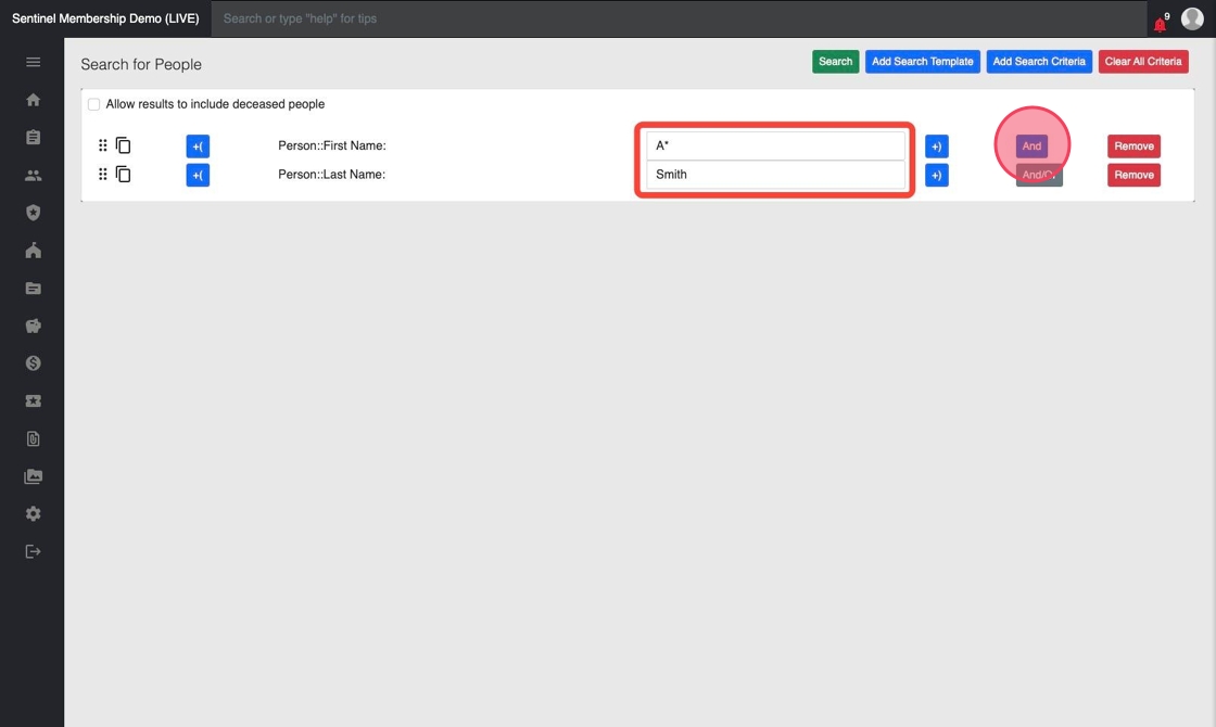 4. We will search for anyone with the last name "Smith" and anyone whose first name begins with the letter "A" by typing an A with an asterisk.