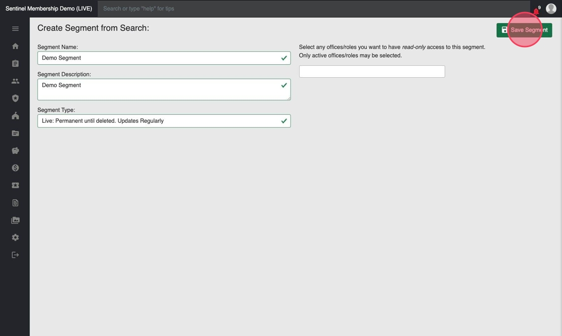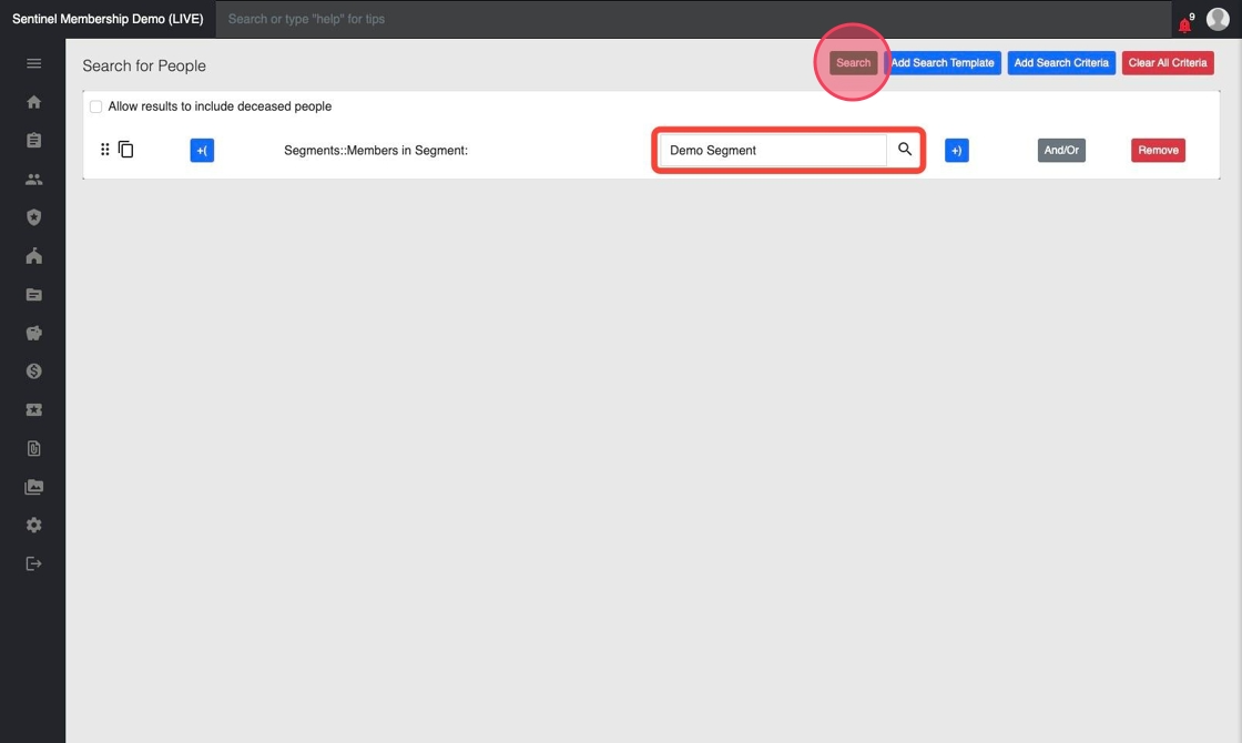 - Live: dynamically updated on a regular basis to add and remove people from the segment as they fall within and out of your search criteria; the segment will exist in Sentinel until you manually delete it